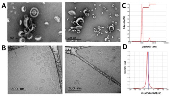 The mean particle size of liposomes was measured using a dynamic particle size analyzer (NanoBrook 900Plus Phase Analysis Light Scattering (PALS) machine). Zeta potential was measured using the NanoBrook 900Plus PALS machine in 25 °C. The morphological analysis of liposome was carried out by TEM (JEOL JEM-1400) using a negative staining method. For morphological observation, samples were placed on the grid and stained with 2% uranyl acetate and analyzed by TEM at Louisiana State University, Baton Rouge. For cryo-TEM, 4 µL sample solution was applied to a glow discharged 300 mesh carbon-coated TEM grid (EMS CF300-cu). After cold stage transfer, the samples were mounted and examined in TEM, operating at an accelerating voltage of 120 kv. The stage temperature was kept below −170 °F and images were recorded at defocus setting with Gatan US1000xp2 camera.