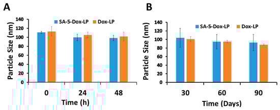 In vitro serum stability of liposomes SA-5-Dox-LP, Dox-LP were investigated using a human serum at 37 °C and 0, 24, and 48 h points. The particle size of liposomes was measured as a marker of the stability of liposomes. The overall particle size of the liposomes incubated in human serum for different durations was relatively constant, as seen in Figure 3A. Next, the stability of liposomes at 4 °C storage conditions was also examined for 90 days. The relative particle size of SA-5-Dox-LP and Dox-LP showed slight changes during this testing period, indicating the stability of liposome for 90 days at 4 °C, as seen in Figure 3B.