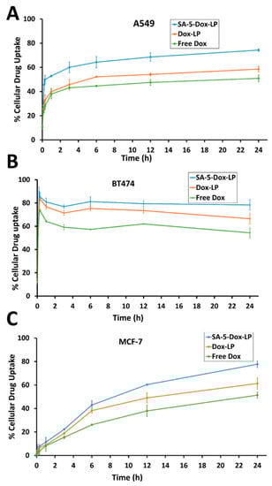 Cellular uptake of encapsulated Dox liposome formulations, as well as free Dox, was carried out. Breast and lung cancer cell lines such as BT-474, MCF-7, and A549 were used. Different cell lines were seeded in six-well plates and incubated at 37 °C under an atmosphere of 5% CO2 and 90% relative humidity. After 80% cell confluency, the medium was changed with Dox-LP, SA-5-Dox-LP formulations, and free Dox and incubated for different times (0, 0.1, 0.2, 0.3, 1, 3, 6, 12, and 24 h). Total Dox incubation was kept the same between free Dox, Dox-LP, and SA-5-Dox-LP by calculating Dox content by entrapment efficiency. Measured liposome solution and free Dox were added to cell medium in 15 mL tube prior to adding to well-plate. After the incubation time, the cells were washed with PBS solution. The cells were then solubilized by adding 0.25% Triton X-100 in PBS solution. The fluorescence intensity of the Dox was measured with a plate reader (485/590 nm). Cellular drug uptake percentage was calculated by measuring cell-related fluorescence after washing against the fluorescence measured in the feed solution.