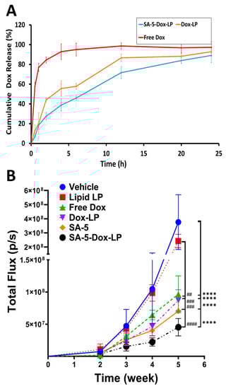 (A) In vitro drug release from SA-5-Dox-LP and Dox-LP at pH 7.5. Results were from triplicate experiments. Dox release was monitored by measuring the fluorescence of doxorubicin and expressed as a percentage calculated as described in the text. LP-liposome. Each data represents mean ± S.D. (B) Anti-tumorigenic activity of SA-5, SA-5-Dox-LP, Dox-LP, free doxorubicin, lipid liposome: SA-5, 6 mg/kg and SA-5-Dox-LP formulation group showed significantly delayed tumor growth as compared to control vehicle and lipid, liposome group. Each data represents mean ± S.D. Statistical analysis: two-way analysis of variance (ANOVA) with Tukey’s test for multiple comparisons. ## p < 0.01, ### p < 0.001, #### p < 0.0001, **** p < 0.0001.