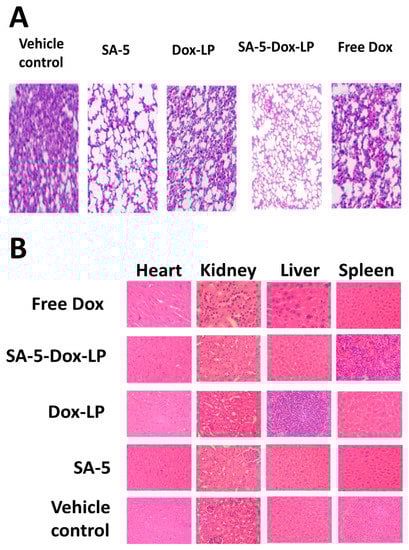 Hematoxylin and eosin (H&E) staining analysis of major organs after treatment. (A) SA-5-Dox-LP and SA-5 alone treated lung tumor slides exhibited normal lung morphology features, while free Dox and doxorubicin liposome treated lung tumor slides show the presence of tumor nest in the lung region. (B) Tissue sections of heart, kidney, liver, and spleen. General morphology indicated that there was no toxicity to major organs at the therapeutic concentration of SA-5-Dox-LP.