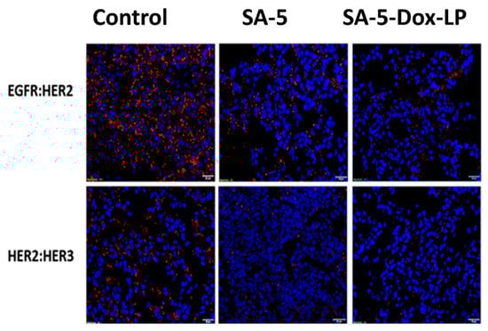 Compound 5 and lipid conjugate of 5 (SA-5) were known to bind to the HER2 protein and inhibit EGFR dimerization in cancer cell lines [15,19]. SA-5 and SA-5-Dox-LP were evaluated for their ability to inhibit EGFR heterodimerization (protein-protein interactions) in vivo sample tissues of the lungs of mice treated with these formulations. Proximity ligation assay (PLA) assay was performed to evaluate inhibition of EGFR: HER2 and HER2-HER3 heterodimerization. Samples of vehicle control groups in the tumor section of mice exhibited red fluorescent dots, suggesting the occurrence of EGFR heterodimerization, as seen in Figure 8. However, red fluorescent dots significantly decreased on the tumor section samples of SA-5 and SA-5-Dox-LP treatment groups, as seen in Figure 8 of the top panel and bottom panel. Overall, results suggested that SA-5 and SA-5-Dox-LP were able to successfully inhibit EGFR heterodimerization in vivo.