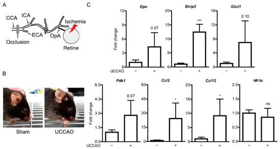 General features of ocular ischemia induced by unilateral common carotid artery occlusion (UCCAO) in adult mice. (A) Schematic illustration of induction of ocular ischemia by UCCAO. Ocular ischemia (a red thunder) can be induced by occlusion (a gray bar) of the common carotid artery (CCA) in that the ophthalmic artery (OpA) is originated from the internal carotid artery (ICA) of CCA. (B) Representative images show eyelid drooping in the eye 1 day after UCCAO. (C) Quantitative analyses (n = 4 per group) show increases in Bnip3, Ccl2, and Ccl12 mRNA expressions in the UCCAO-operated retina 1 day after UCCAO, in comparison with those in the sham-operated retina. * p < 0.05, *** p < 0.001. The data were analyzed using Student’s t-test (two-tailed) and presented as mean ± standard deviation.