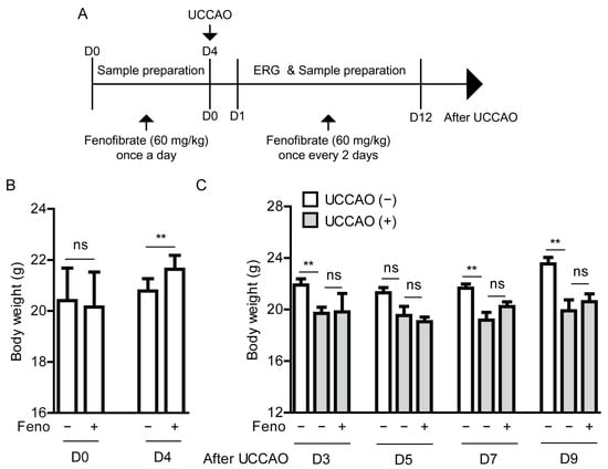 General observations for adult mice after oral administration of fenofibrate (A) A schematic illustration shows oral administration of fenofibrate to mice and a time point of induction of UCCAO and following experiments. ERG; electroretinography, UCCAO; unilateral common carotid artery occlusion. (B) Changes in body weight after oral administration of fenofibrate before UCCAO (n = 5–11 per group). (C) Changes in body weight after oral administration of fenofibrate after UCCAO (n = 5–6 per group). ** p < 0.01. The data were analyzed using Student’s t-test (two-tailed) or one-way ANOVA followed by a Bonferroni post hoc test, and presented as mean ± standard deviation. Feno; fenofibrate.