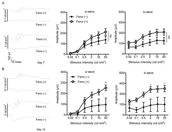 Protective effects of fenofibrate against retinal dysfunction induced by UCCAO. (A) Representative waveforms of a- and b-waves (low and high intensities, 0.1 and 2 cd·s/m2, respectively) and quantitative analyses (n = 9–11 per group) show that oral administration of fenofibrate slightly suppressed reduction in the amplitude of b-wave in the UCCAO-operated eye 7 days after UCCAO. (B) Representative waveforms of a- and b-waves (low and high intensities, 0.1 and 2 cd·s/m2, respectively) and quantitative analyses (n = 5–6 per group) show that oral administration of fenofibrate dramatically suppressed reduction in the amplitude of b-wave in the UCCAO-operated eye 12 days after UCCAO. * p < 0.05, ** p < 0.01. The data were analyzed using two-way ANOVA followed by a Bonferroni post hoc test and presented as mean ± standard error of the mean. Feno; fenofibrate. UCCAO; unilateral common carotid artery occlusion.