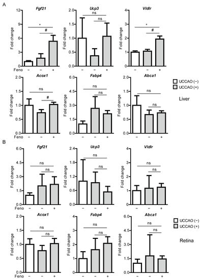 Increases in PPARα downstream gene expressions in the liver by oral administration of fenofibrate in the UCCAO-operated mice. (A) Quantitative analyses (n = 3 for sham group; 4–5 per UCCAO group) show that oral administration of fenofibrate significantly increased Fgf21, Vldlr, and Acox1 expressions in the liver 7 days after UCCAO. (B) Quantitative analyses (n = 3 for sham group; 4–5 per UCCAO group) show that oral administration of fenofibrate did not change expressions of PPARα downstream gene in the retina. * p < 0.05 (one-way ANOVA), # p < 0.05 (Student’s t-test). The data were analyzed using Student’s t-test (two-tailed) or one-way ANOVA followed by a Bonferroni post hoc test and presented as mean ± standard deviation. Feno; fenofibrate. UCCAO; unilateral common carotid artery occlusion.