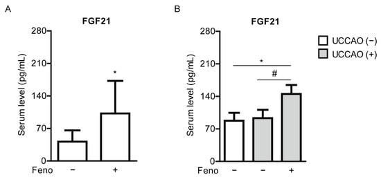 Increases in serum levels of FGF21 by oral administration of fenofibrate in adult mice. (A) Quantitative analyses (n = 7–8 per group) show that oral administration of fenofibrate significantly increased FGF21 levels in the blood 4 days after oral administration of fenofibrate, right before UCCAO. * p < 0.05 (Student’s t-test). (B) Quantitative analyses (n = 6 per group) show that oral administration of fenofibrate increased FGF21 levels in the blood 12 days after UCCAO. * p < 0.05 (one-way ANOVA), # p < 0.05 (Student’s t-test). The data were analyzed using Student’s t-test (two-tailed) or one-way ANOVA followed by a Bonferroni post hoc test and presented as mean ± standard deviation. Feno; fenofibrate. UCCAO; unilateral common carotid artery occlusion.