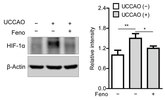 Previously, it was reported that UCCAO could induce stabilization of hypoxia-inducible factor-1α (HIF-1α) in the retina [14]. Therefore, we examined whether this finding could be affected by oral administration of fenofibrate. Stabilized HIF-1α expression was significantly observed in the retina 8 h after UCCAO, and its expression significantly decreased in the fenofibrate-administered retina, in comparison with that in the vehicle-administered retina (Figure 6).