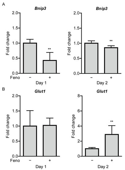 Modulation of retinal hypoxia-responsive gene expressions by oral administration of fenofibrate in the UCCAO-operated mice. (A) Quantitative analyses (n = 4–7 per group) show that oral administration of fenofibrate significantly reduced increases in expressions of Bnip3 in the retina 1 and 2 days after UCCAO. (B) Quantitative analyses (n = 4–7 per group) show that oral administration of fenofibrate increased Glut1 expressions in the retina 2 days after UCCAO. ** p < 0.01. The data were analyzed using Student’s t-test (two-tailed) and presented as mean ± standard deviation. Feno; fenofibrate. UCCAO; unilateral common carotid artery occlusion.