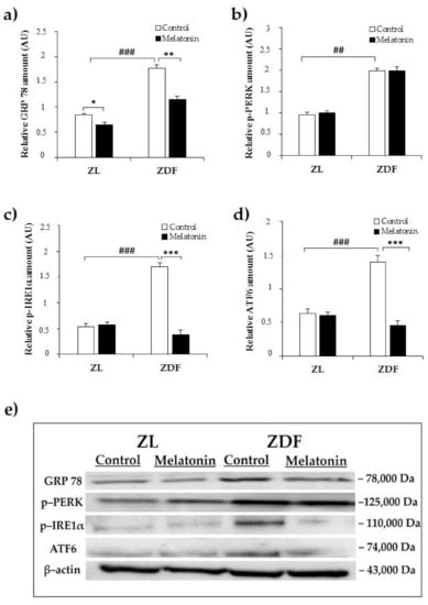 ER stress plays an important role in the development of diabesity-related kidney disease []. To study ER stress in the kidney of ZDF rats and the possible effect of melatonin supplementation on this situation, we assayed the expression level of the main ER stress markers (GRP78, phospho–PERK, phospho–IRE1α, and ATF6) using Western blot analysis.