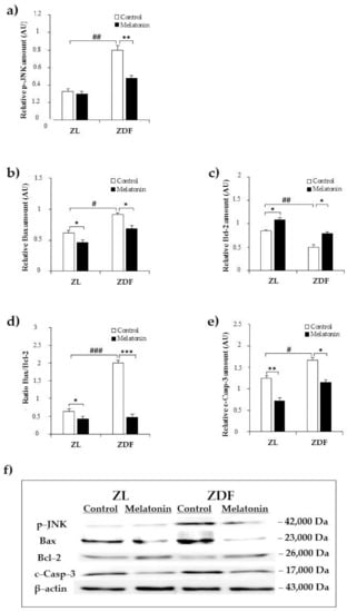 Effects of melatonin supplementation on ER stress-related apoptotic markers in the kidney of Zücker lean and diabetic fatty rats as measured by Western blot. (a–c,e) Densitometry quantification of p–c–jun amino terminal kinase (JNK), Bax, B cell lymphoma (Bcl)-2, and cleaved caspase-3 protein levels. (d) Bax/Bcl-2 ratio expression. (f) Representative blot of phospho–JNK, Bax, Bcl-2, and cleaved caspase-3. C–ZL: control lean rats without melatonin; M–ZL: lean rats with melatonin; C–ZDF: control diabetic fatty rats without melatonin; M–ZDF: diabetic fatty rats with melatonin; ZL: Zücker lean rats; ZDF: Zücker diabetic fatty rats. Values are means ± S.E.M (n = 3) of ratios of specific protein levels to β–actin (Loading protein). # p < 0.05, ## p < 0.01, ### p < 0.001 C–ZDF vs. C–ZL; * p < 0.05, ** p < 0.01 M–ZL vs. C–ZL; *** p < 0.001 M–ZL vs. C–ZL; * p < 0.05, *** p < 0.001 M–ZDF vs. C–ZDF (Tukey post hoc test).