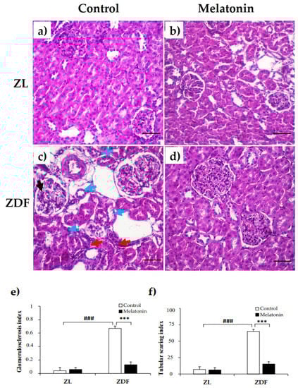 Effects of melatonin on renal tissue morphology of Zücker lean and diabetic fatty rats. (a,b) Representative photomicrographs showing normal appearance of the glomerulus and tubules in C–ZL (left panel) and M–ZL rats (right panel). (c) Early focal segmental glomerulosclerosis (FSGS) and tubulointerstitial damage were noted in C–ZDF rats, with a left glomerulus showing segmental mesangial hypercellularity and mild segmental endocapillary (black arrow) and on the right showing hypertrophy, associated with interstitial fibrosis (red arrows) and mild tubular degeneration as shown with epithelial cells atrophy and loss of brush borders and cell polarity (blue arrows). (d) Normal structure of renal tissue was observed in M–ZDF rats, with lower severity of FSGS and normal renal tubules, and no signs of fibrosis. (H&E stain; original magnification at ×100). (e,f) Semi-quantitative analysis of glomerulosclerosis index (left panel) and tubular index (right panel) scores in ZL and ZDF rats. C–ZL: control lean rats without melatonin; M–ZL: lean rats with melatonin; C–ZDF: control diabetic fatty rats without melatonin; M–ZDF: diabetic fatty rats with melatonin; ZL: Zücker lean rats; ZDF: Zücker diabetic fatty rats. Values are means ± S.E.M (n = 6). ### p < 0.001 C–ZDF vs. C–ZL; *** p < 0.001 M–ZDF vs. C–ZDF (Tukey post hoc test). Scale bar: 200 µm.