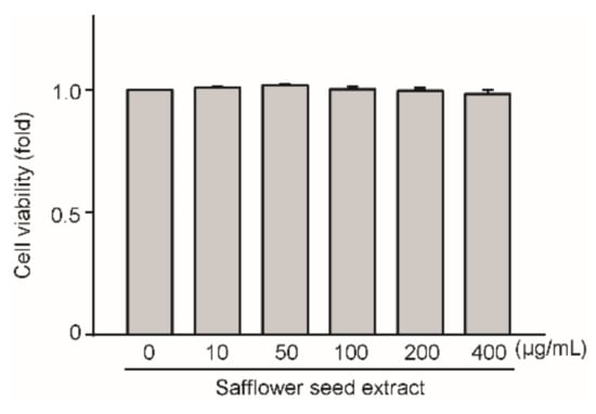 We determined whether safflower seed extract exerts any toxic effects on chondrocytes by treating the cells with safflower seed extract at concentrations of 10, 50, 100, 200, and 400 μg/mL for 24 h. As shown in Figure 1, the viability of the chondrocytes did not differ from that of the control. The results indicate that safflower seed extract has no toxicity against chondrocytes at the indicated concentrations; thus, all subsequent experiments were performed at concentrations of 100, 200, and 400 μg/mL for 24 h.