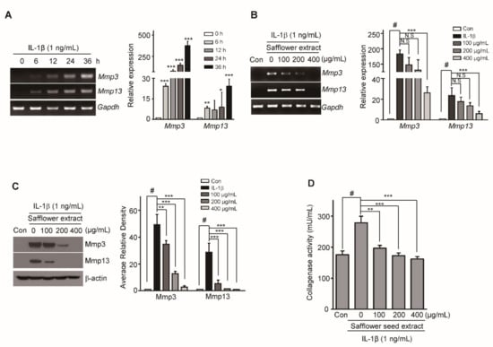 Safflower seed extract reduces matrix metalloproteinases (MMP3 and MMP13) expression in articular chondrocytes induced by IL-1β. Chondrocytes were treated with IL-1β (1 ng/mL) in a time-dependent manner (A) and co-treated with different concentrations (100, 200, and 400 µg/mL) of safflower seed extract (B). The mRNA expression levels of Mmp3 and Mmp13 were measured using RT-PCR (A,B, left) and qRT-PCR (A,B, right). The protein expression of MMP3 and MMP13 was determined by western blotting (C, left) and quantified by densitometry (C, right). Gapdh and β-actin were used as the loading controls. Collagenase activity in safflower seed extract-treated chondrocytes was evaluated using the Enzchek gelatinase/collagenase assay and detected by ELISA at 482/530 nm (D). Data are shown as mean ± SD of each group (n = 5). # p < 0.05 compared with the control; * p < 0.05, ** p < 0.01, and *** p < 0.001 compared with the IL-1β-treated or safflower seed extract-treated groups.