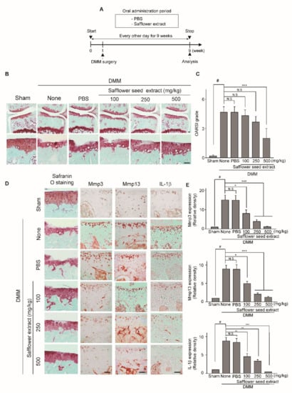 For the subsequent histological analysis, the animals were euthanized by CO2 inhalation 10 weeks after the surgery, and mouse knee joints were fixed in 4% paraformaldehyde, decalcified, and embedded in paraffin. Cartilage destruction was followed by safranin O staining and scored according to the OARSI grading system. Immunohistochemistry was performed in mouse knee joint section using anti-MMP3 (ab52915, Abcam), anti-MMP13 (ab51072, Abcam), and anti-IL-1β (CST). Oral administration of safflower seed extract was performed three times a week for 10 weeks, and the mice were sacrificed after the oral gavage.