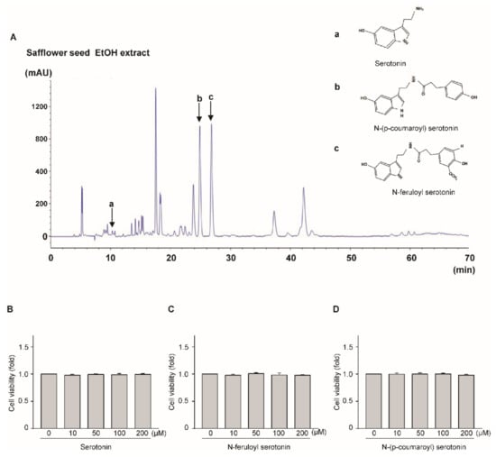 HPLC spectrum of serotonin (a), N-(p-coumaroyl) serotonin (b), and N-feruloyl serotonin (c) in safflower seed extract and standard compounds (A). Toxicity of serotonin (B), N-feruloyl serotonin (C) and N-(p-coumaroyl) serotonin (D) against chondrocytes. The toxicity of serotonin, N-(p-coumaroyl) serotonin, and N-feruloyl serotonin against chondrocytes was measured at concentrations of 0, 10, 50, 100, and 200 μM for 24 h using the LDH assay.
