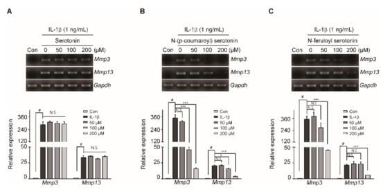 N-(p-coumaroyl) serotonin and N-feruloyl serotonin, but not serotonin, decreased the expression of MMP3 and MMP13 induced by IL-1β in articular chondrocytes. Chondrocytes were treated with various concentrations (0, 50, 100, and 200 µM) of serotonin, N-(p-coumaroyl) serotonin, and N-feruloyl serotonin (B). The mRNA expression levels of Mmp3 and Mmp13 were measured by RT-PCR (A,B,C; upper panel) and qRT-PCR (A,B,C; lower panel). Gapdh was used as the loading control. Data are presented as mean ± SD of each group (n = 5). # p < 0.05 compared with the control; * p < 0.05, *** p < 0.001 compared with the IL-1β-, serotonin-, N-(p-coumaroyl) serotonin-, and N-feruloyl serotonin-treated groups.
