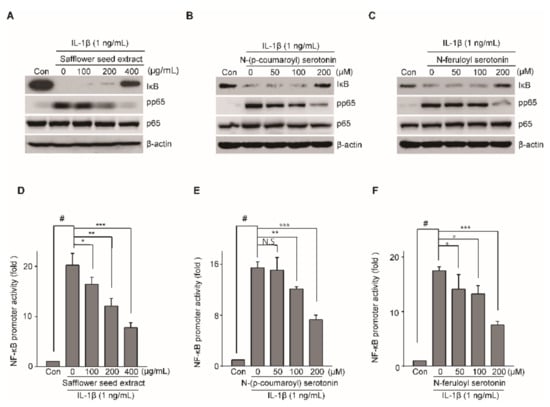 Safflower seed extract, N-(p-coumaroyl) serotonin, and N-feruloyl serotonin regulate IL-1β-induced NF-κB activation. Articular chondrocytes were pretreated with safflower seed extract, N-(p-coumaroyl) serotonin, and N-feruloyl serotonin at various concentrations for 24 h (n = 5) before IL-1β (1 ng/mL) treatment for 15 min. Protein expression of IκB and pp65 was determined by western blotting (A,B,C; upper panel) and densitometry (A,B,C; lower panel). β-Actin was used as the loading control. The NF-κB promoter activity was evaluated using the luciferase assay after treatment with safflower seed extract, N-(p-coumaroyl) serotonin, and N-feruloyl serotonin (D,E,F). Data are shown as mean ± SD of each group (n = 5). # p < 0.05 compared with the control; * p < 0.05, ** p < 0.01, and *** p < 0.001 compared with the IL-1β-treated or safflower seed extract-treated groups.