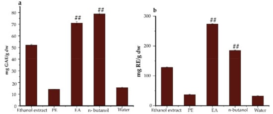 The total flavonoids and phenolics compositions (TFC & TPC) in Ficus glumosa ethanol extracts and fractions were determined while using two equations that were obtained from standard calibration curves: y = 1.535x − 0.0335, R2 = 0.9982 for TFC, and y = 1.9908x − 0.0202, R2 = 0.9993 for TPC. For TFC (Figure 1a), the EA fraction exhibited the highest content of 274.05 ± 0.68 mg RE/g, followed by n-butanol fraction with 185.34 ± 1.30 mg RE/g. Moreover, for TPC (Figure 1b), the n-butanol fraction showed the highest phenols accumulation of 78.87 ± 0.97 mg GAE/g, followed by the EA fraction with 70.99 ± 1.40 mg GAE/g. The observed trends of both TFC and TPC were in descending order of EA > n-butanol > ethanol extracts > PE > water, (8.44:5.71:3.96:1.14:1) and n-butanol > EA > ethanol extracts > water > PE, (5.56:5.01:3.67:1.10:1), respectively.