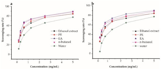 The percentage (%) scavenging rates of ethanol extracts, petroleum ether (PE), ethyl acetate (EA), n-butanol, and water fractions of Ficus glumosa. (a) The % radical scavenging rates of DPPH (2,2-diphenyl-1-picrylhydrazyl) assay, and (b) ABTS (2,2′-azino-bis (3-ethylbenzothiazoline-6-sulfonic acid) assay exhibited by ethanol extracts, PE, EA, n-butanol, and water fractions of Ficus glumosa.