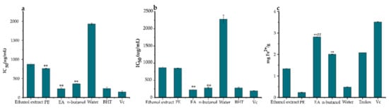 The antioxidant activities of ethanol extracts, petroleum ether (PE), ethyl acetate (EA), n-butanol, and water fractions of Ficus glumosa in IC50 and mg Fe2+/g. (a) The IC50 values of DPPH (2,2-diphenyl-1-picrylhydrazyl) assay, (b) ABTS (2,2’-azino-bis (3-ethylbenzothiazoline-6-sulfonic acid) assay, and (c) FRAP (ferric-ion reducing power) assay exhibited by ethanol extracts, PE, EA, n-butanol, and water fractions of Ficus glumosa, and positive controls; BHT (butylated hydroxytoluene), Vc (vitamin c). ** p < 0.05 and ## p < 0.05 as compared to ethanol extracts and Trolox, respectively.