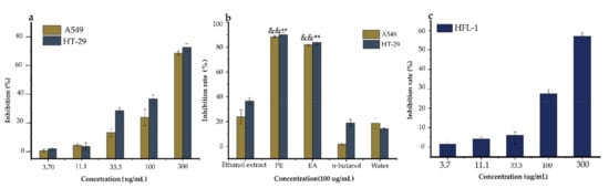 The antiproliferative activity of the ethanol extracts, PE (petroleum ether), EA (ethyl acetate), n-butanol, and water fractions of Ficus glumosa. (a) The (%) inhibition rates of HT-29 and A549 cells by different concentrations of ethanol extracts of Ficus glumosa. (b) The % inhibition rates of A549 and HT-29 cells treated with ethanol extracts, PE, EA, n-butanol, and water fractions of Ficus glumosa. (c) The toxicity of ethanol extracts of Ficus glumosa on normal lung (HFL-1) cells. && p < 0.01, ** p < 0.01 when compared to ethanol extracts.