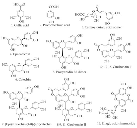 Flavonoids possess versatile health-promoting effects, as demonstrated in previous studies [60]. Majorly, flavanols constituted a higher percentage of components in the EA fraction. Bansal [61] highlighted that flavanols’ biological properties tend to be influenced by the position and number of OH groups, the presence of catechol/pyrogallol groups on the B-ring, OH groups at positions C3, C5, and C7, and their degree of polymerization. In this regard, bioactivity decrease from trimers to monomers, whilst it increases from trimers to tetramers, whereas the ease of degradation varies with the type of interflavan bond in oligomers, with epicatechin being more easily oxidized than catechin [62]. In the present study, epicatechin (4), procyanidin B2 dimer (5), catechin (6), (epi)afzelechin-(4-8)-(epi)catechin (7), cinchonain II (8), and cinchonain I (10) were tentatively identified in this species and they were previously reported with some biological importance. They possess antioxidant, anti-inflammatory, and antiproliferative properties for the case of catechin (6) and epicatechin (4) [63], procyanidin B2 dimer (5) [64], and (epi)afzelechin-(4-8)-(epi)catechin (7) [65]. Further, cinchonain I (10) and II (8) compounds are reported to depict good antioxidant potential [66,67]. Ellagic acid-rhamnoside (16) was earlier assayed and found to exhibit high antioxidant and antibacterial properties [68,69].