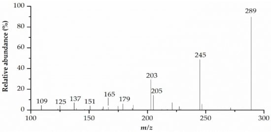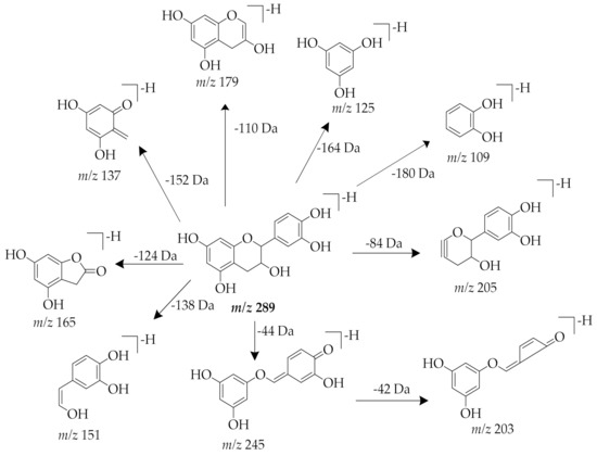 Compounds 4 and 6 showed a similar protonated precursor ion at m/z 335 [M+HCOOH-H]−, which corresponds to formate adduct [M+HCOO]− that formed from formic acid in the A-mobile phase. The MS2 ion at m/z 289 generated fragments at m/z 245 [M-H-C2H4O]−, 205 [M-H-84]−, 203 [M-H-C2H4O-C2H2O]−, 179 [M-H-110]−, 165 [M-H-124]−, 151 [M-H-C7H6O3]−, 137 [M-H-152]−, 125 [M-H-164]−, and 109 [M-H-180]−. The fragment ion at m/z 245 resulted from a loss of a C2H4O group. The cleavage of A ring produced the fragment ion at m/z 205. The elimination of a catechol group (C6H6O2) yielded the ion at m/z 179. After heterocyclic ring fission (HRF), the B-ring was eliminated, generating fragment ion at m/z 165. The loss of rings A and C yielded ion at m/z 109. The ion at m/z 203 was produced from a molecular ion at m/z 245 after cleavage at the C-ring. Analyzing the elution order, retentions, and abundance of the fragments, the two compounds were concluded as isomers. When comparing the MS2 spectra data and proposed fragmentation mechanism (Figure 7 and Figure 8) of these compounds with recent data reports, compound 4 and compound 6 were tentatively identified as epicatechin and catechin, respectively [48,49].