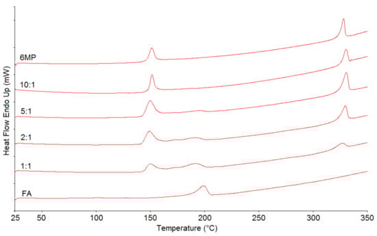 Since DSC is a rapid screening technique, it is commonly used in the initial assessment of drug–drug and drug–excipient compatibility []. 6MP and FA were thus analyzed separately and in 1:1, 2:1, 5:1 and 10:1 ratios. The results are shown in Figure 2. The thermogram of 6MP showed two distinct and sharp, endothermic peaks at 151.16 and 328.14 °C, with onsets at 146.77 and 323.80 °C, corresponding to the loss of hydrate water and the melting of 6MP, respectively. Similar results have been obtained by other research groups [,]. The thermogram of FA showed one relatively broad endothermic peak at 198.86 °C, with an onset at 188.19 °C, possibly corresponding to the melting of the substance. This finding is in accordance with the literature []. Regarding the thermograms of the blends, a minor broadening of the peaks can be observed. In addition, the peak temperatures of both 6MP peaks in all the blends shifted slightly either to higher or lower temperatures (shift up to 2.44 °C). As for FA, the shift to a lower temperature was even more evident (up to 7.88 °C). Moreover, the peak of FA in the 5:1 blend was barely visible, even more so in the 10:1 blend. In conclusion, no peaks in the blends disappeared, or new peaks appeared, as compared to pure 6MP and FA, but the peaks somewhat broadened and shifted. This occurrence could simply be due to the mixing of both drugs, lowering the purity of each substance and not their incompatibility []. However, the ratio intended for the FDC could not be analyzed using this technique owing to its lower sensitivity, as well as to the intrinsically broad peak of the FA thermal event. Thus, other approaches were considered so as to corroborate the DSC results.
