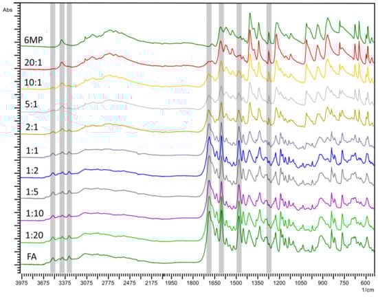 Fourier-transform infrared spectroscopy (FTIR) spectra of 6MP, FA and their physical blends. Numbers denote the 6MP:FA mass ratios in the blends. Greyed areas denote the characteristic bands referred to in the text.