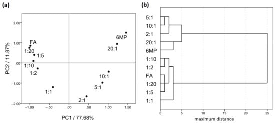 (a) Principal component analysis (PCA) scatterplot of 6MP, FA and blends. (b) Dendrogram of the cluster analysis (CA) for 6MP, FA and blends. Numbers denote the 6MP:FA mass ratios in the blends.