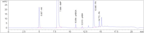 Chromatogram of a standard solution containing 10 µg/mL of hypoxanthine (HX), 500 µg/mL of 6MP, 0.5 µg/mL of p-aminobenzoylglutamic acid (pABGA), 0.125 µg/mL of p-aminobenzoic acid (pABA), 25 µg/mL of FA and 0.5 µg/mL of pteroic acid (PA).