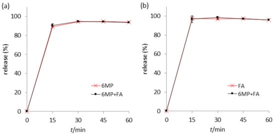 As the conditions, as well as chemical composition, in the human gastrointestinal system are widely different than those during long-term storage, there is a possibility that the active substances could interact with each other. Therefore, the stability of the active substances in the presence of each other in a medium similar to that physiologically present should be assayed. A simulated intestinal fluid mimicking the fasted state was chosen for this purpose, seeing that the compounds are absorbed in the small intestine. Stability testing in a gastric medium was omitted, because the conditions present in the fasted-state stomach are similar to those used in acidic hydrolysis. Moreover, the drugs are not expected to reside in the acidic medium for a longer amount of time, since the fasted-state emptying time for about 85% of the gastric content is half an hour []. The testing was conducted on commercially available 6MP and FA tablets individually and in combination in 500 mL of FaSSIF thermostated at 37.0 °C, with the rotation speed of 75 rpm to replicate the physiological conditions as much as possible. Individual testing of 6MP and FA tablets showed the release of active substances after 60 min to be higher than 93.8% (6MP) and 95.6% (FA) of the declared value (Figure 6). When the formulations were subjected to the dissolution medium simultaneously, no remarkable difference was detected in the percentages released at any sampling time point, as the maximum difference in the average drug release in individual and simultaneous dissolutions was lower than 1.5% at all time points for both substances. Furthermore, no additional peaks as compared to individual dissolutions were observed. The RSDs of the same time points in triplicates of all the dissolution tests were lower than 3.6%, indicating formulation homogeneity of the batches. All the above observations point to the absence of chemical interactions of 6MP and FA in FaSSIF, from which a parallel can be drawn to the physiological conditions of the intestinal medium.