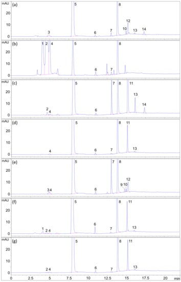Forced degradation chromatograms of the formulation blend. (a) Acidic hydrolysis, (b) basic hydrolysis, (c) oxidative, (d) thermal (solid), (e) thermal (solution), (f) photolysis (solid) and (g) photolysis (solution). Legend: 6MP—5; FA—8; HX—4; pABGA—6; PA—9; 6MP degradants—1, 2, 7, 11, 13 and 14 and FA degradants—3, 10 and 12.