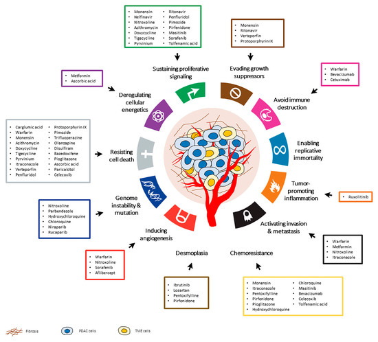 The HIV protease inhibitor nelfinavir and the antibiotic nitroxoline have been studied for the treatment of pancreatic cancer as single agents or in combination with other drugs. Nelfinavir can sensitize pancreatic tumor cells to radiotherapy and has been tested for the treatment of different stages of pancreatic cancer [115,116,117]. Regarding nitroxoline, this drug has shown antitumor effects in distinct types of cancer, including the suppression of angiogenesis and inhibition of tumor cell migration and invasion [118].