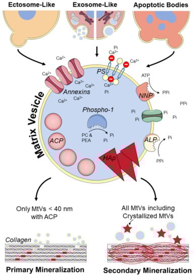 ApoBDs also seem to influence mineralization indirectly, by enhancing ALP and inhibiting NNP-1 exposure on the membranes of endplate chondrocytes [131]. This results in more available inorganic phosphate, which promotes mineralization [131]. Taken together, because MtVs exhibit multiple characteristics that are involved in calcium and phosphate accumulation, all MtVs may contribute to matrix mineralization regardless of their biogenesis pathway. Our findings on the different types of MtVs and their physical, biological, and functional properties as described in the previous sections are summarized in Table 2.