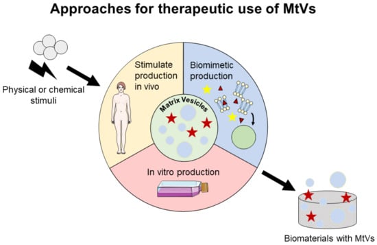 Overall, the MtV-producing cells can be chemically and physically stimulated, and induced MtV secretion in vitro. Secreted MtVs can be isolated and delivered to the site of interest via localized or systemic applications, for example, via injection. For both local and systemic delivery, a major challenge is to attain a suitable concentration of vesicles at the target site [144,198]. The use of biomaterials with integrated MtVs could help in delivering the vesicles to the targeted region in an appropriate concentration and allows for a controlled release of vesicles in this region. The in vivo application of chemical and physical stimuli has showed increased mineralization; thus, the release of MtVs can potentially be enhanced in the applied area. Further studies should investigate the in vivo secretion of MtVs under such stimuli.