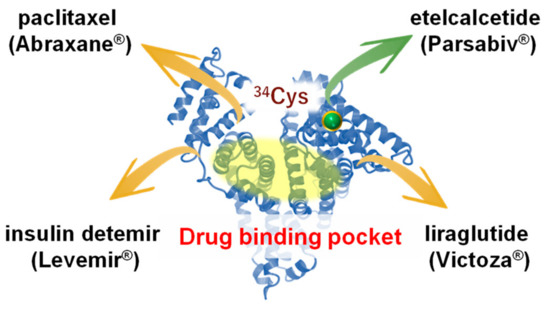 With the advancements in biotechnology and protein science, many albumin-associated pharmaceutical preparations are currently on the market, such as nab-paclitaxel (Abraxane®), albumin nanoparticles prepared by nab technology [8]. Nab-paclitaxel (Abraxane®) makes it possible for paclitaxel to be delivered in a soluble form without the need for a solubilizing agent (polyoxyethylated castor oil; Cremophor®), which is used in a conventional paclitaxel preparation (Taxol®). A clinical benefit of using albumin as an alternative to Cremophor® is the decreased severe side effects, such as hypersensitive reactions. Albumin also facilitates transcytosis across the endothelial barrier, thus leading to the high distribution of paclitaxel in the region of the cancer via the albumin receptor (gp60) [8]. Another example of an albumin product is etelcalcetide (Parsabiv®), a linear heptapeptide preparation that is used for treating secondary hyperparathyroidism in chronic kidney disease patients who are on hemodialysis. This product has a long duration of action due to the presence of a disulfide bond between albumin and etelcalcetide [9]. In addition to nab-paclitaxel (Abraxane®) and etelcalcetide (Parsabiv®), other pharmaceutical preparations, such as Levemir® and Victoza® etc., also involve the use of albumin-associated preparations [10]. These preparations take advantage of the following inherent structural and physiological characteristics of albumin—Albumin has a good biocompatibility with a long plasma half-life, the aqueous solubility of endogenous and exogenous hydrophobic substances can be improved by their binding to albumin, and the cysteine residue at position 34 of albumin readily reacts with oxidative products and other thiol groups (Figure 1).