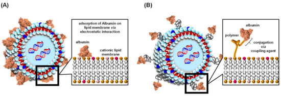 Two types of albumin-coated liposomes have been reported—A liposome that contains albumin that is linked to a polymer, or albumin adsorbed on the surface of a cationic liposome via electrostatic interactions (Figure 2). This section reviews our current state of knowledge concerning albumin-coated liposomes as a DDS carrier, focusing on the benefits of using albumin-coated liposomes in biomedical applications.