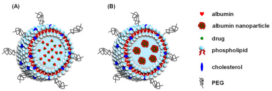 Schematic structure of the albumin-encapsulated liposome-encapsulated albumin-drug complex (A) and drug-loaded albumin nanoparticle (B).