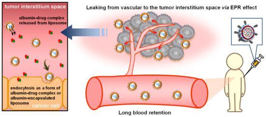 Albumin-encapsulated liposomes were developed to deliver drugs to solid tumors, such as melanoma [76,78], breast cancer [83], pancreatic ductal adenocarcinoma [52,77], and pancreatic cancer [84]. The accumulation of albumin-encapsulated liposomes in an inflammatory site in the coon using a mice model of colitis has also been evaluated [85]. The primary strategy for the delivery of albumin-encapsulated liposomes is based on the concept that liposomes with a size of ~200 nm can passively accumulate into the tumor and the inflammatory site (Figure 5), a process that is referred to as the enhanced permeability retention (EPR) effect [86,87]. As expected, albumin-encapsulated liposomes successfully accumulated in solid tumors and inflammatory sites in all previously reported studies. Albumin-encapsulated liposomes accumulated at a higher level in melanoma [76,78] and pancreatic ductal adenocarcinoma [52,77] compared to albumin nanoparticles. This superior accumulation of albumin-encapsulated liposomes into the tumor is thought to contribute to the high antitumor and anti-inflammatory efficacies of these systems, as described below.