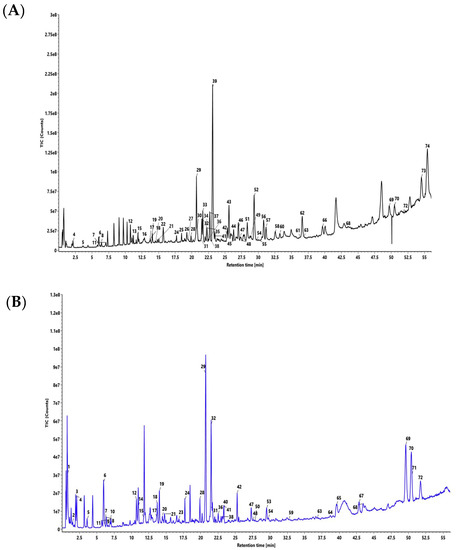Total ion chromatogram of seventy-four compounds characterized in Divya-Swasari-Vati (DSV) in (A) positive mode and (B) negative mode using UPLC/QToF MS. The seventy-four compounds are, (1) quinic acid, (2) galloyl glucose, (3) gallic acid, (4) Theogallin, (5) protocaechuic acid, (6) methyl gallate, (7) 3, 4-di-O-galloylquinic acid, (8) chlorogenic acid, (9) 1,6-di-O-galloyl-glucose, (10) digallic acid, (11) cryptochlorogenic acid, (12) neoliquiritrin, (13) liquiritigenin, (14) ellagic acid, (15) quercetin-3-O-β-d-glucuronide, (16) coumarin, (17) kushenol O, (18) licurazide, (19) liquiritin apioside, (20) liquiritrin, (21) N-feruloyltyramine, (22) cinnamic acid, (23) 24-hydroxy licoricesaponin A3, (24) licoricesaponin A3 (25) glabrolide, (26) eugenol, (27) piperanine, (28) licoricesaponin G2, (29) glycyrrhizin, (30) piperyline, (31) 3-o-(β-d-glucoronopyranosyl (1-2)-β-d-galacto pyranosyl) glycyrrhetic acid, (32) licoricesaponin K2, (33) 6-gingerol, (34) 4,5-dihydropiperlonguminine, (35) piperlonguminine, (36) licoricesaponin J2, (37) feruperine, (38) licoricesaponin C2, (39) piperine, (40) shinpterocarpin, (41) licoricesaponin B2, (42) glabridin, (43) piperettine, (44) piperolein A, (45) dipiperamide E, (46) retrofractamide A, (47) glabrol, (48) 1- methoxyphaseollidin, (49) piperolactam-C9:1 (8E), (50) 1-methoxyphaseollin, (51) dehydropipernonaline, (52) pipernonaline, (53) 2-αhydroxyursolic acid, (54) licochalcone A, (55) dipiperamide-D, (56) piperolein B, (57) pipercide, (58) 10,11-dihydropipercide, (59) sophoranodichromane D, (60) piperundecalidine, (61) shinflavanone, (62) guineesine, (63) glycyrrhetic acid, (64) ursolic acid, (65) glycyrrhetol, (66) liquidambronal, (67) betulonic acid, (68) oleanonic acid, (69) deoxyglabrolide, (70) glypallidifloric acid, (71) 5-hydroxyeicosatetraenoic acid, (72) ginkgolic acid, (73) N-isobutyl-(2E,4E)-octadecadienamide, (74) pipnoohine.