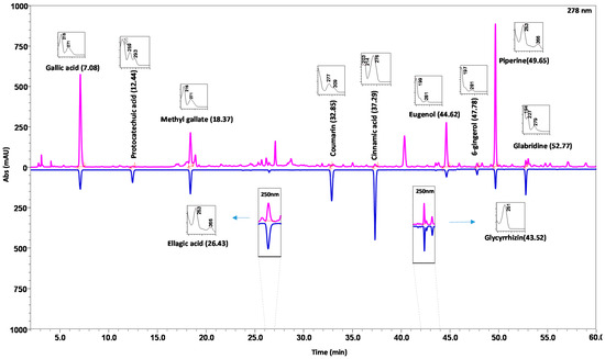 HPLC–DAD analysis identified and quantified the presence of 11 targeted marker components in DSV. The DSV sample (pink lines) was compared using reference standard mix (blue lines). The chromatograms were recorded at 278 nm for (methyl gallate, coumarin, cinnamic acid, eugenol, 6-gingerol, piperine and glabridin), and at 250 nm for ellagic acid and glycyrrhizin. UV-spectra of each detected analyte has been shown in the respective insets, along with HPLC retention times.