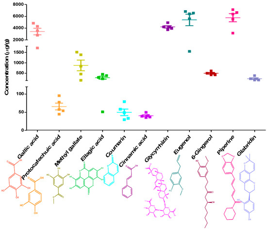 Quantitative analysis of gallic acid, protocatechuic acid, methyl gallate, ellagic acid, coumarin, cinnamic acid, glycyrrhzin, eugenol, 6-gingerol, piperine and glabridin using HPLC-DAD analysis in five different batches of Divya-Swasari-Vati (DSV). Scatter plot show detected concentrations of each analyte with mean and SEM (n = 5), in DSV formulation. Chemical structure of analytes have been sourced from www.pubchem.com (accessed on 22 March 2021).