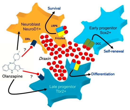 The mechanism of olanzapine action on draxin-releasing cells including Tbr2/NeuroD1-expressing late neural progenitors in the SGZ is not clear. Studies reporting effects of dopaminergic agonists/antagonists on hippocampal adult neurogenesis suggest very indirectly that these cell populations may express dopamine receptors (Figure 2). For instance, a blockade of D2 receptors with haloperidol promoted adult neurogenesis by enhancement of neural-progenitor generation in the rat SGZ [32]; however, no effect of dopamine modulators on this process was reported [33]. Conversely, another study showed stimulatory effect of D2 agonist on adult neurogenesis in mouse SGZ/SVZ in vitro [34]. The complete receptor profile of neural stem and progenitor cells remains understudied, which makes it currently impossible to formulate any convincing conclusions. Possibly, the enhancement of draxin expression in the adult hippocampus after long-term treatment with olanzapine may reflect the same neuroleptic effect during developmental neurogenesis. Atypical antipsychotic administration in early prenatal life may potentially disturb cerebral cortex histogenesis and neural circuit organization [35]; however, a potential role of chemorepulsive draxin signaling in this effect remains unknown. A confirmation of draxin neurochemistry in the context of pharmacomodulation requires further studies; e.g., quantification of the peptide concentration with Western blotting or mRNA-level assessment. Despite the limitations of our study, it may cautiously suggest that draxin can be considered as novel and potentially important regulatory molecule of the brain.