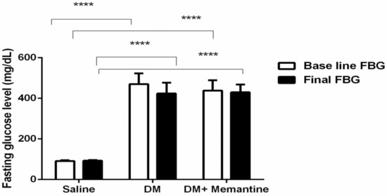 Effect of memantine on the blood glucose level. Fasting blood glucose was measured before memantine therapy and at the end of the experiment. The data are the mean ± standard deviation of the mean (SDM) and were analyzed by one-way ANOVA and Tukey’s tests. DM: diabetes mellitus mice, **** p < 0.0001 versus the saline group.