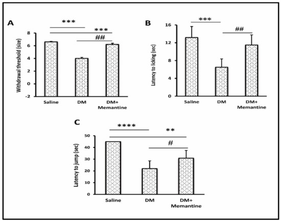 Effect of memantine on allodynia and hyperalgesia. Diabetic mice were tested for (A) the von Frey test, (B) latency to licking (sec) and (C) latency to jump. Data are the mean ± SDM and analyzed by one-way ANOVA and Tukey’s tests. DM: diabetes mellitus mice, SDM: standard deviation of the mean. ** p < 0.01, *** p < 0.001, and **** p < 0.0001, versus the saline group; # p < 0.05 and ## p < 0.01 versus the DM group.