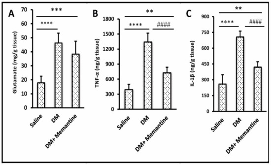 Effect of memantine on spinal glutamate and inflammatory mediators. Spinal cord samples were analyzed for (A) glutamate, (B) TNF-α, and (C) IL-1β. Data are the mean ± SDM and analyzed by one-way ANOVA and Tukey’s tests. DM: diabetes mellitus mice, and SDM: standard deviation of the mean, TNF-α: tumor necrosis factor-α, IL-1β: interlukin-1β. ** p < 0.01, *** p < 0.001, and **** p < 0.0001, versus the saline group; #### p < 0.0001 versus the DM group.