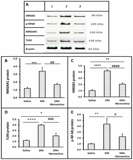 Figure 4 shows the protein content of N-methyl-D-aspartate type 1 receptor (NMDAR1), HMGB1, TLR4, and p-NF-kB versus the β-actin protein. Analysis of the Western blot results highlighted a greater spinal level of the NMDAR1 (2.85-fold, Figure 4A,B), HMGB1 (4.1-fold, Figure 4A,C), TLR4 (3.16-fold, Figure 4A,D), and p-NF-kB (4.39-fold, Figure 4A,E) proteins in the DM group versus the saline group. The DM+memantine group showed a significantly lower content of these spinal markers compared to the DM group (Figure 4B–E).