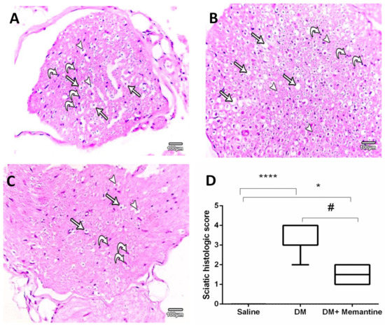 Microscopic pictures of hematoxylin and eosin stained sections of sciatic nerves. (A) An image from the saline group presenting multiple axons (arrowheads) found in different thicknesses of myelin sheathes (arrows) and enclosed within the endoneurium with multiple nuclei of Schwann cells (curved arrows). (B) Diabetic group (DM) showing several lost axons (arrows) with lost myelin sheathes (arrowheads) with some Schwann cell nuclei (curved arrows). (C DM+memantine shows normal neuronal axons (arrowheads) with normal myelin sheath (arrows) and an increased number of Schwann cells nuclei (curved arrows). ×100 bar 100 μm. (D)) Data from histopathologic scoring of the sciatic nerve sections as a box-whisker plot demonstrating the median values and analyzed by Kruskal–Wallis ANOVA. * p < 0.05, and **** p < 0.0001, versus the saline group; # p < 0.05 versus the DM group.